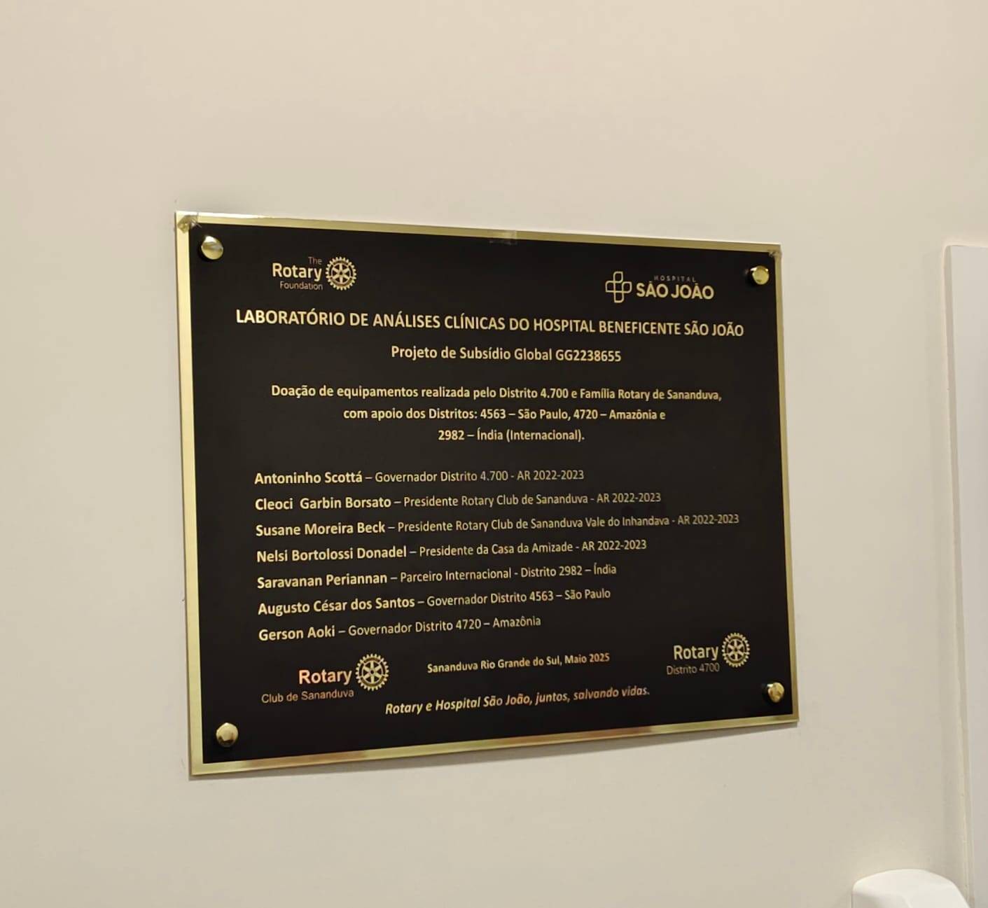 No dia 12.05.2025, a presidente do RC Sananduva Vale do Inhandava, Analise Sauer Caprini, acompanhada dos companheiros Carlos Brusso, Zenir Perondi e Lucas Benetti, estiveram presentes na inauguração do Laboratório de Análises Clínicas do Hospital São João, de Sananduva.